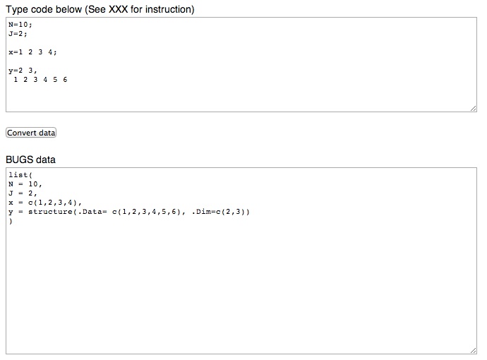 Input data directly (Edit)To input and convert data, one can follow the link: http://webjags.psychstat.org/modules/data/tobugs.php .Then a screen below is shown. On the screen, one can simply type the data. Each piece of information is separated by a semi-colon ;. For each information, its name is first given and then followed by =. A scalar, vector, or matrix can be used. For a vector, a list of values need to be provided. One can change to a new line if needed. For a matrix, the dimension of the matrix is first given and then the data information. The dimension and data are separated by comma ,.