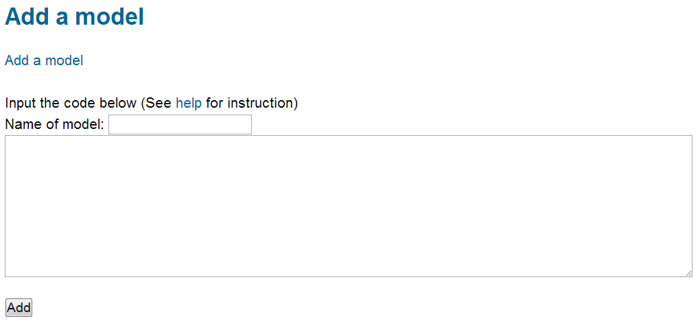 Add a model (Edit)To add a model, click the button Add a model to see the screen shown below. Then, one can input the name of the model and the jags code for the model. Click the button Add once finished.