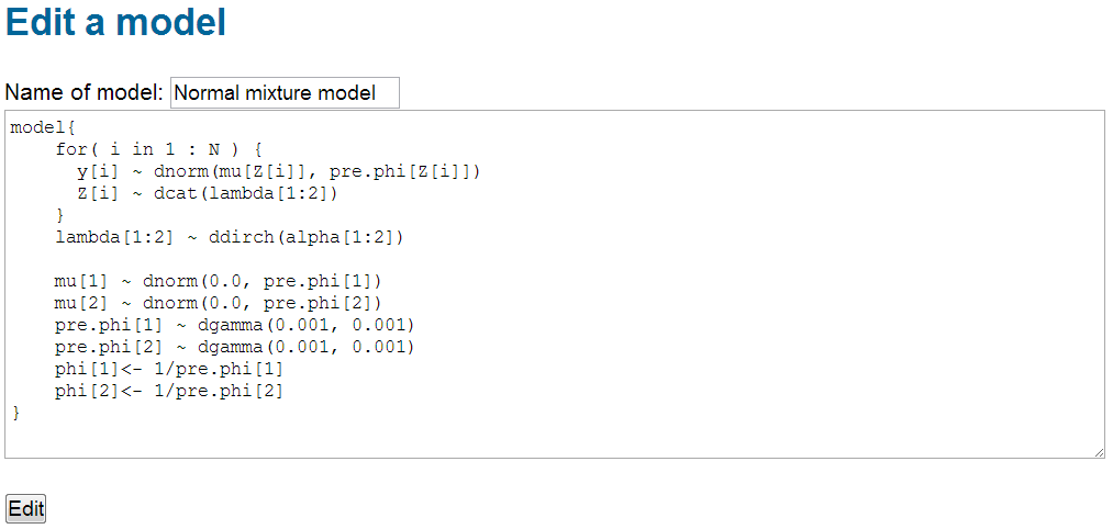 Edit a model (Edit)To edit a model, click the name of the model to see the screen shown below. Then, one can change the name of the model and the jags code for the model. Click the button Edit once finishing edits.