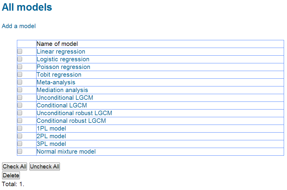 Remove a model (Edit)To remove a model, check the checkbox before the model list and then click the button Delete.